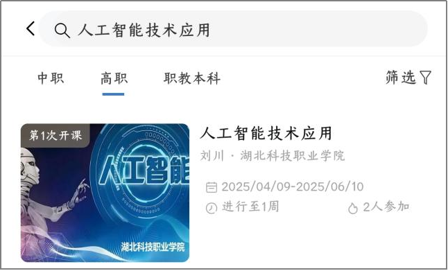 3.点击“高职”,选择《人工智能技术应用》课程,加入学习。