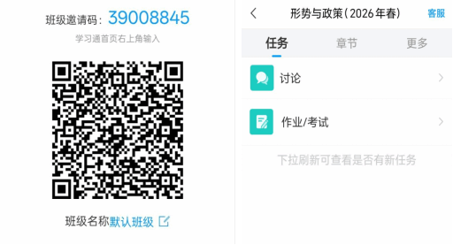 本次补考可通过电脑端和手机端登录学习通平台参加。请考生通过学习通扫描下方二维码,或输入班级邀请码加入班级,在“任务”栏目下的“考试”模块完成考试。