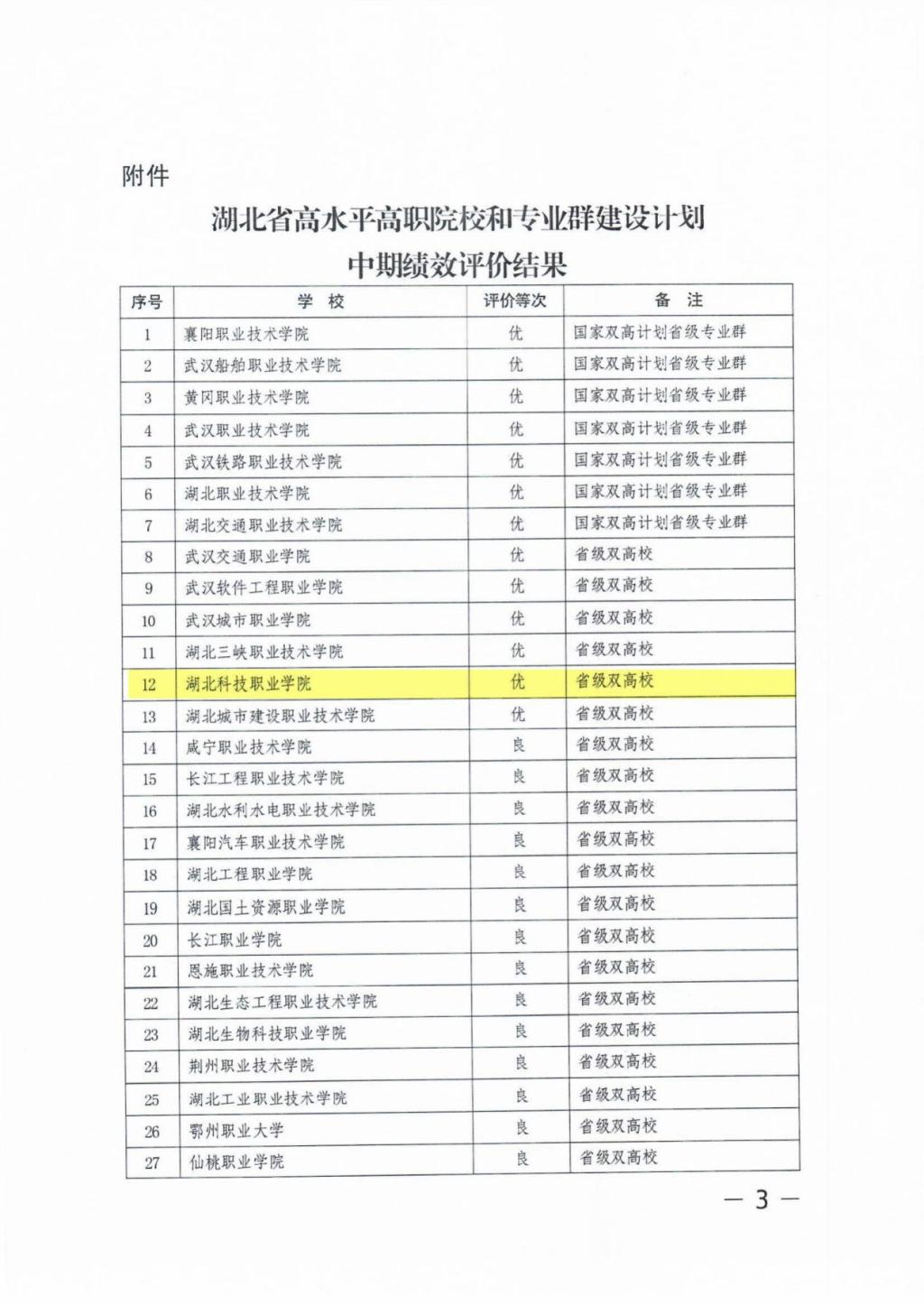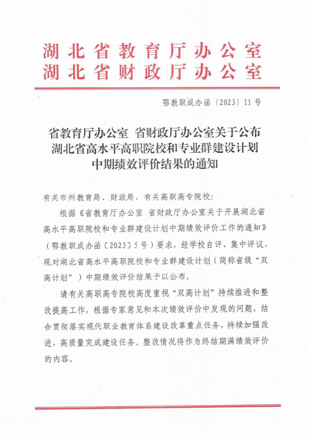 本网讯(通讯员 詹乐/文 卢义平/图)9月11日,省教育厅办公室省财政厅办公室发布了《关于公布湖北省高水平高职院校和专业群建设计划中期绩效评价结果的通知》,我校获评“优秀”等次,排名第12,比省“双高”校立项时前进3个位次,此次共有47所建设单位参加了绩效评价,获评优秀等次的学校仅13所。