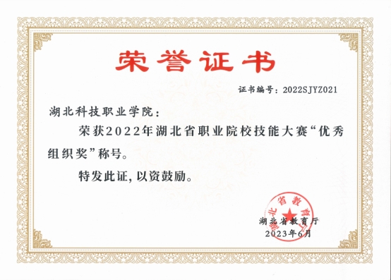 本网讯(通讯员 胥海燕 文/图)日前,湖北省教育厅发布《关于2022年湖北省职业院校技能大赛获奖名单的公示》,我校获得“2022年湖北省职业院校技能大赛优秀组织奖”的荣誉称号。在大赛组织和备赛期间,在校领导的高度重视下,职院教务处联合相关职能部门到各赛项备赛现场进行指导,及时跟进各学院师生赛事进度、解决其备赛困难,大力支持并鼓励各学院在赛事中秉持着勇于作为、敢于创新的赛事精神,参赛、办赛成绩突出,获得省厅表彰。
