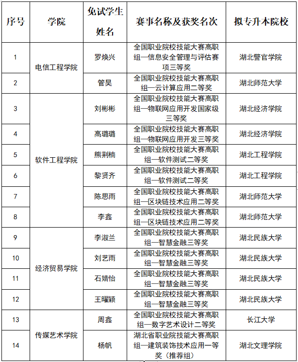 (本网讯 通讯员 胥海燕 文/图)近日,湖北省教育厅发布《省教育厅关于做好2024年湖北省普通高等学校专升本工作的通知》。根据最新政策要求,经申报审核后,我校2021级共14名优秀学子凭借出色的技能大赛成绩脱颖而出,荣获专升本免试资格,直接升入本科院校深造。