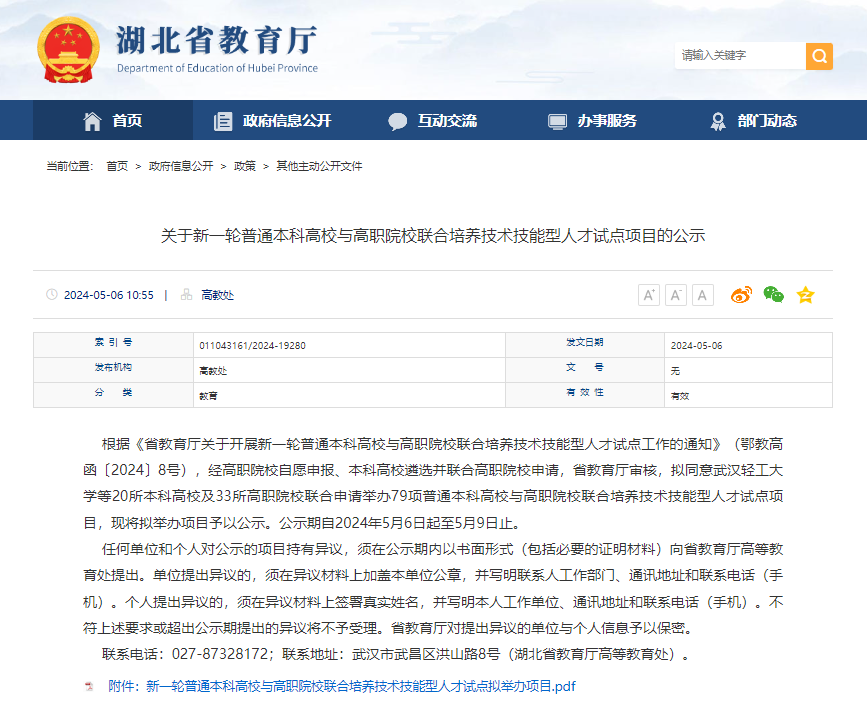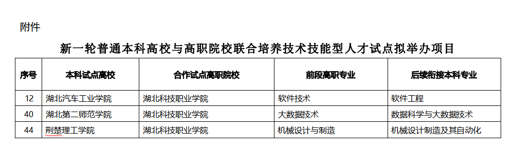 本网讯(通讯员 詹乐/文 卢义平/图)近日,湖北省教育厅公示了新一轮普通本科高校与高职院校联合培养技术技能型人才试点项目的名单,我校软件技术、大数据技术和机械设计与制造三个专业成功入选。我校将与湖北汽车工业学院、湖北第二师范学院、荆楚理工学院三所优秀的公办普通本科高校开展深度合作,共同推进技术技能型人才的培养。