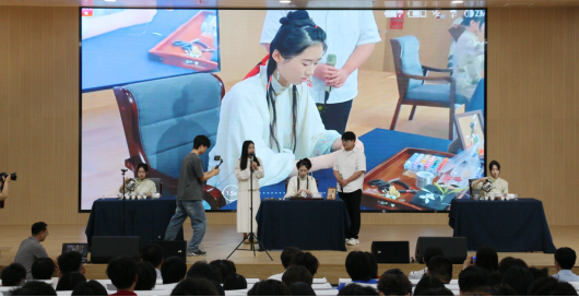 会议临近尾声,为呼应2024年职教周活动主题,工商管理学院联合传媒艺术学院联手带来了一场富有创意的现场技能展示节目。本次技能展示的内容是以一场直播的形式讲述一段茶饮与花的故事。