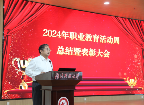 最后,湖北科技职业学院党委常委、校长钟毓宁教授作总结讲话。钟校长对去年参加技能竞赛并取得优异成绩的同学和老师们表示热烈的祝贺,同时也感谢所有参与备赛工作的幕后英雄们,希望受表彰团队与个人认真总结参赛经验、再创佳绩。他强调,职教周的举办积极展示我校职业教育特色和办学成果,作为职教人,我校师生更应做有理想、负责任的行动主义者,为此,钟校长提出以下三点希望:一要树立工匠精神,坚定面向未来的发展信心。要以大国工匠为榜样,志存高远,追求技能,精进技能,用奋斗点亮青春。二要深刻认识和把握新时代职业教育的新使命,增强学习工作的不懈动力。要切实增强责任感使命感紧迫感,不负国家和人民的殷切期盼,更加努力培养更多高素质技术技能人才。三要实实在在地把职业教育搞好,开创学校人才辈出的新局面。学校将重点围绕产教融合,紧贴湖北“52010”和武汉“965”现代产业集群需求,深化产教融合。期待学校有更多优秀的学生、教师脱颖而出,站在各行各业高水准技能的前列,走出湖北走向全国甚至走向世界。