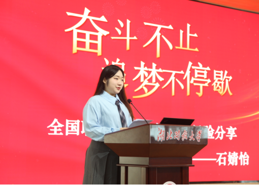 随后,由经济贸易学院学生代表石婧怡上台作获奖经验分享。石婧怡从备赛训练的苦、参赛过程的酸、捧回奖杯的甜讲述了我校学子在参赛过程中一路风雨一路成长的故事。